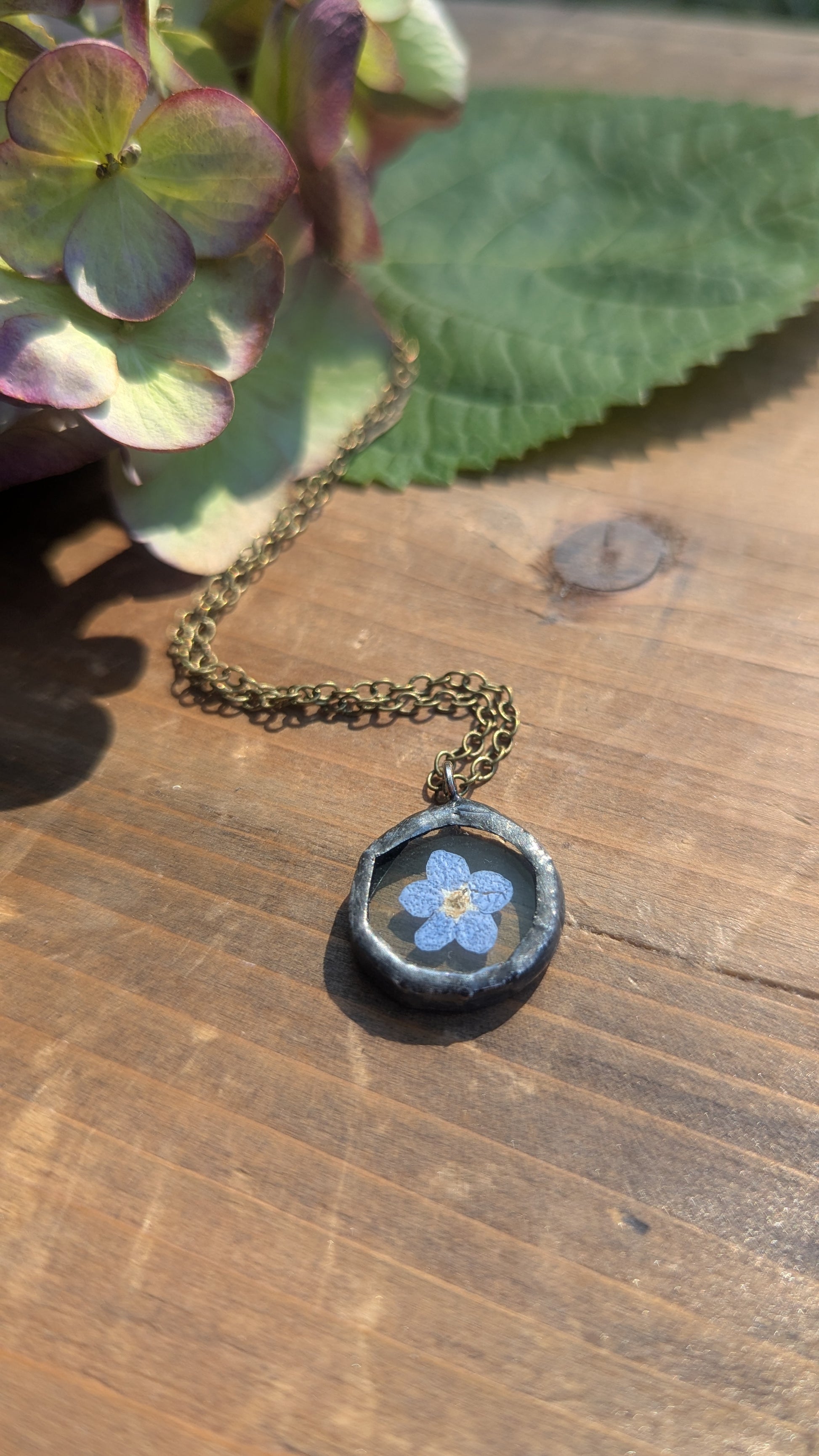 Real pressed flowers inside of necklace