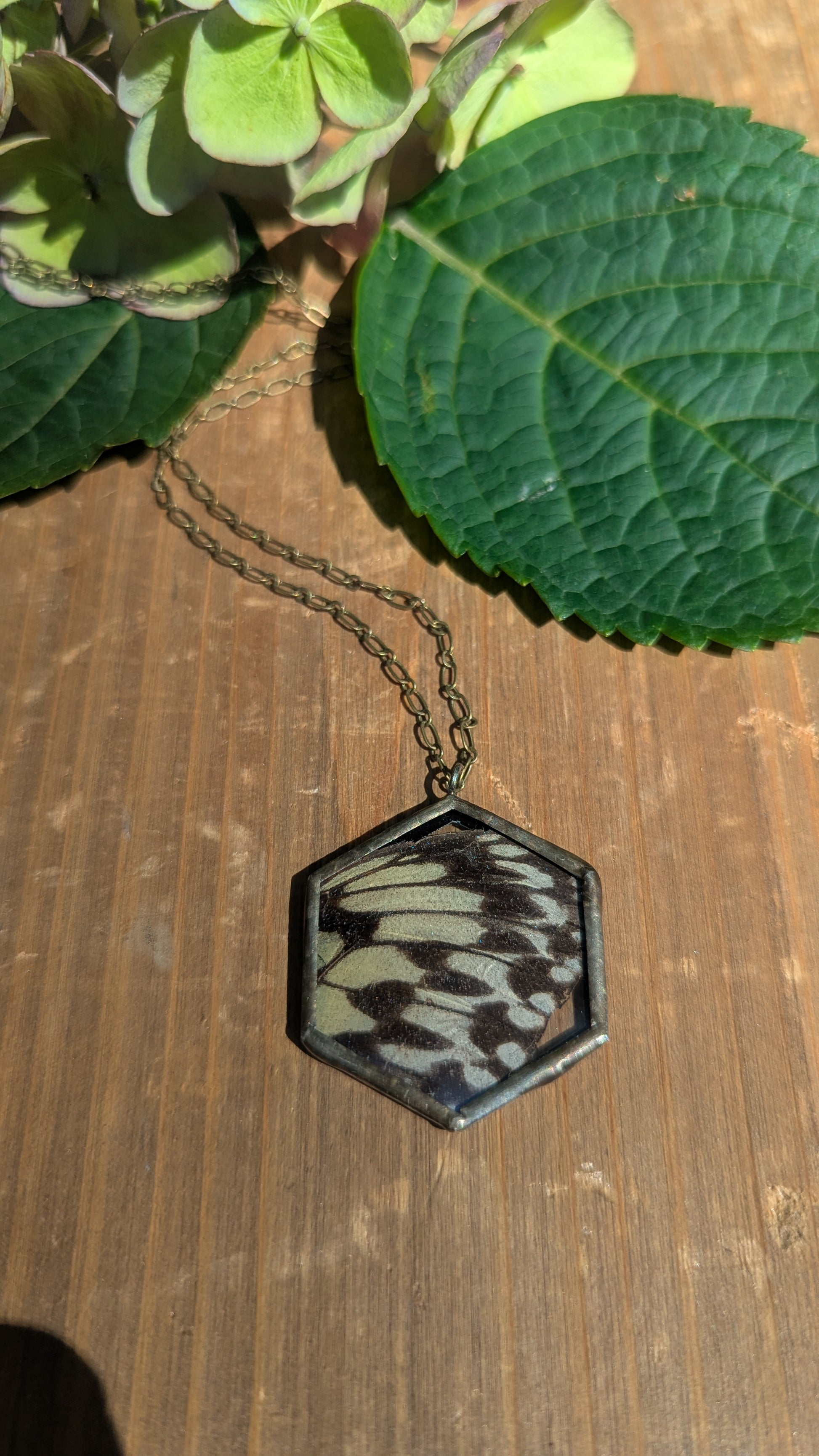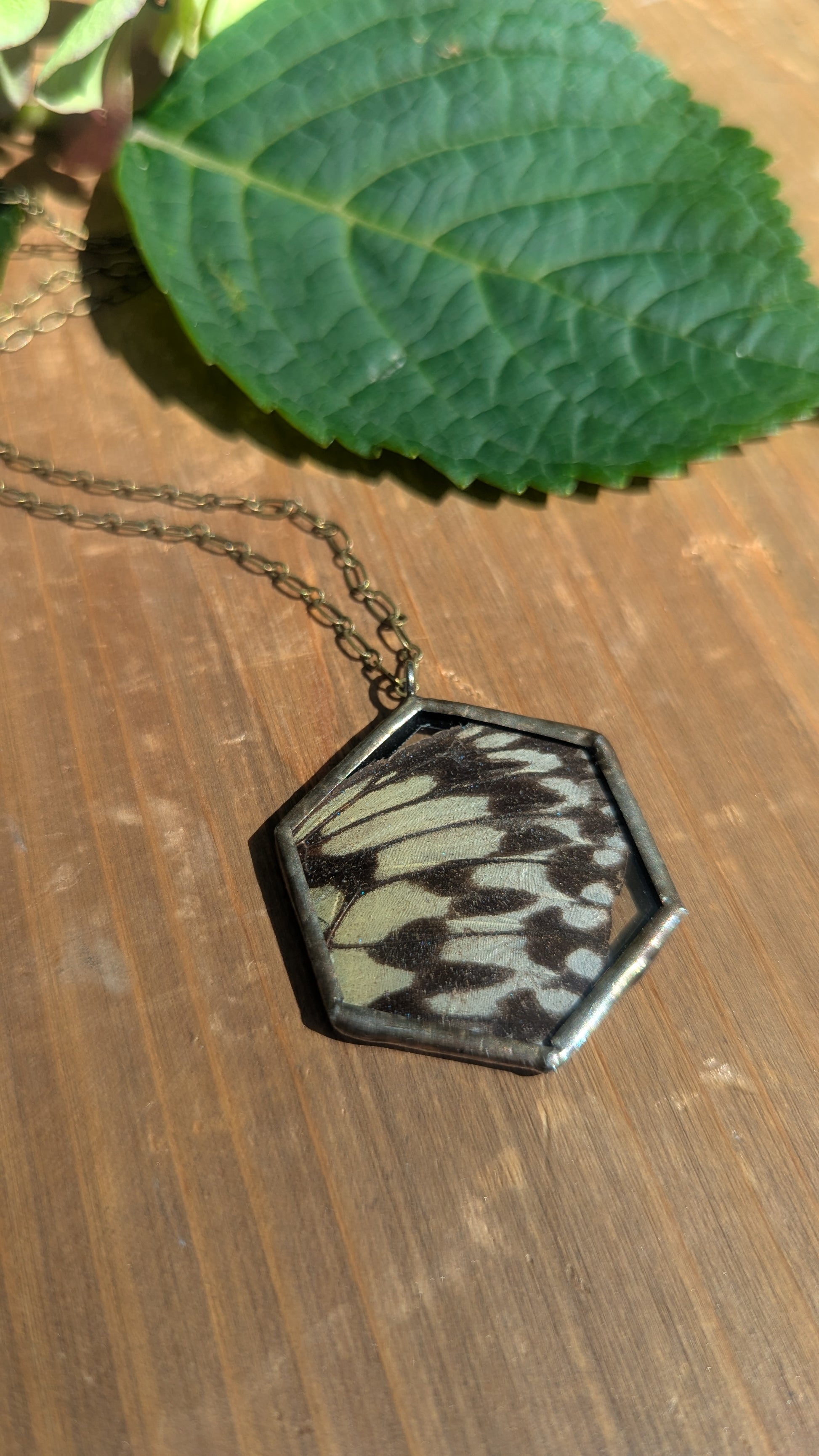 Real pressed butterfly wing inside of necklace (humanely sourced)